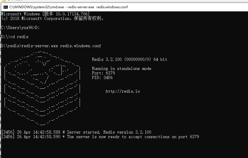 3.cmd命令,切换到redis目录中,使用命令启动redis服务,指定conf配置文件,否则无法启动